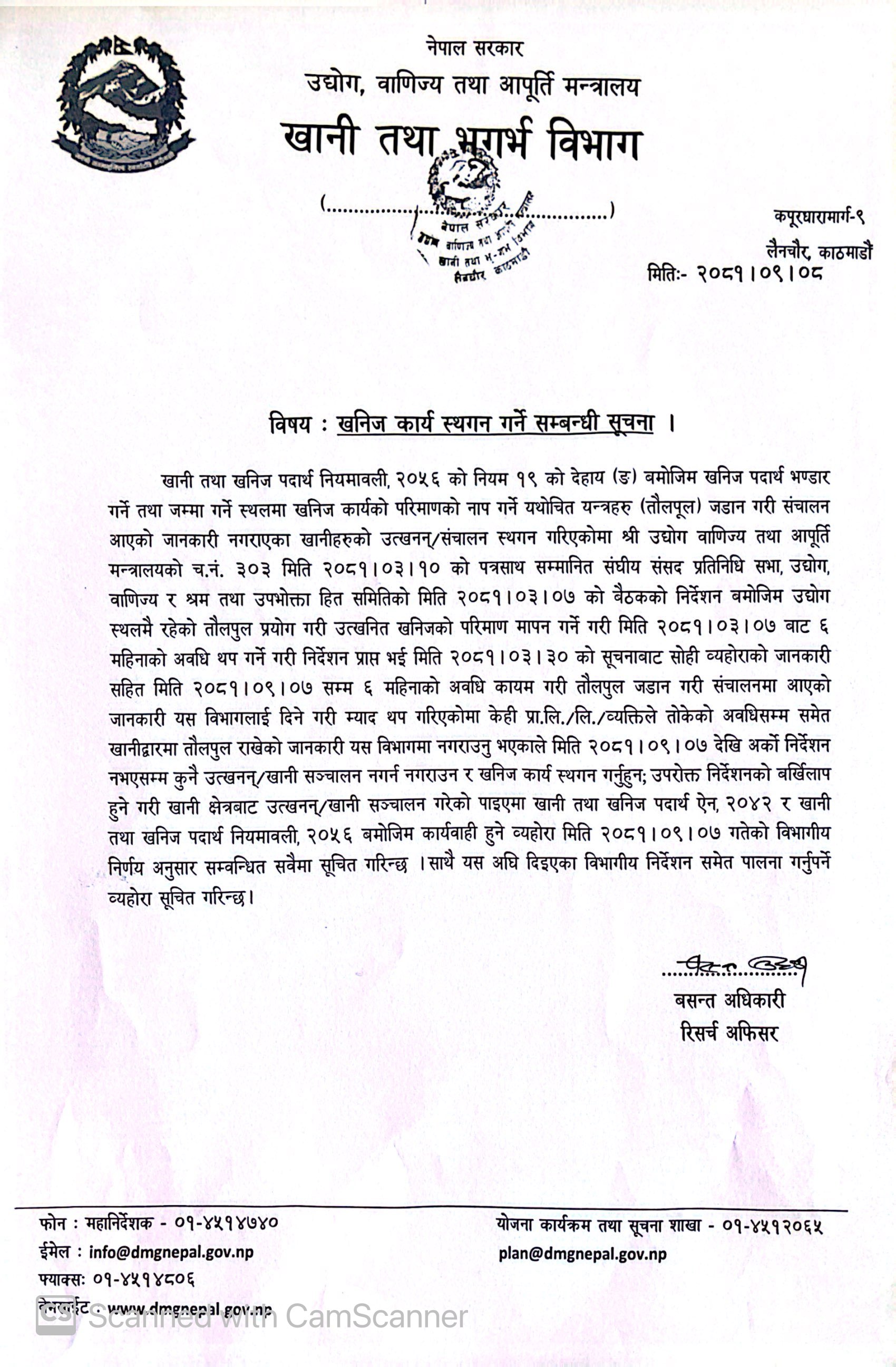 Notice regarding the adjournment of mineral operations