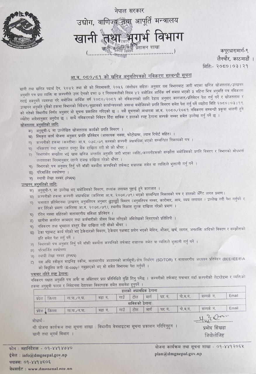 Notice regarding renewal of mineral license for F.Y. 2080/81