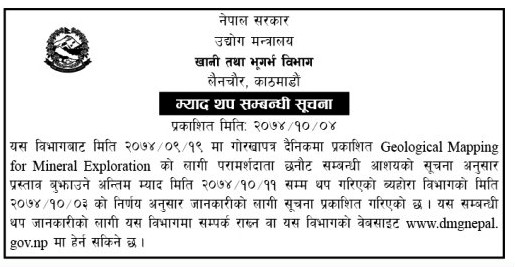 यस विभागबाट मिति 2074/09/19 मा गोरखापत्र दैनिकमा प्रकाशित Geological Mapping for Mineral Exploration को लागी परामर्शदाता छनौट सम्बन्धी आशयको सुचना अनुसार प्रस्ताव बुझाउने अन्तिम म्याद आशयपत्र मा केहि संशोधन गर्नु परेकाले मिति 2074/10/11 सम्म थप गरिएको ब्यहोरा विभागको मिति 2074/10/03 को निर्णय अनुसार जानकारीको लागी सुचना प्रकाशित गरिएको छ। यस सम्बन्धी थप जानकारीको लागी यस विभागमा सम्पर्क राख्न सकिने छ।