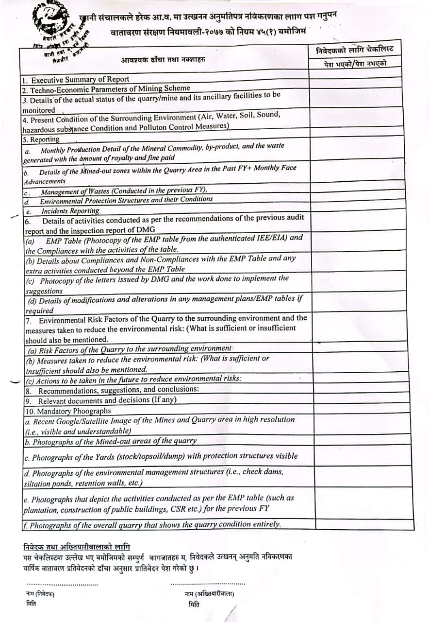 खानी संचालकले हरेक आ.व. मा उत्खनन अनुमतिपत्र नविकरणका लागि पेश गर्नुपर्ने कागजातको चेकलिष्ट