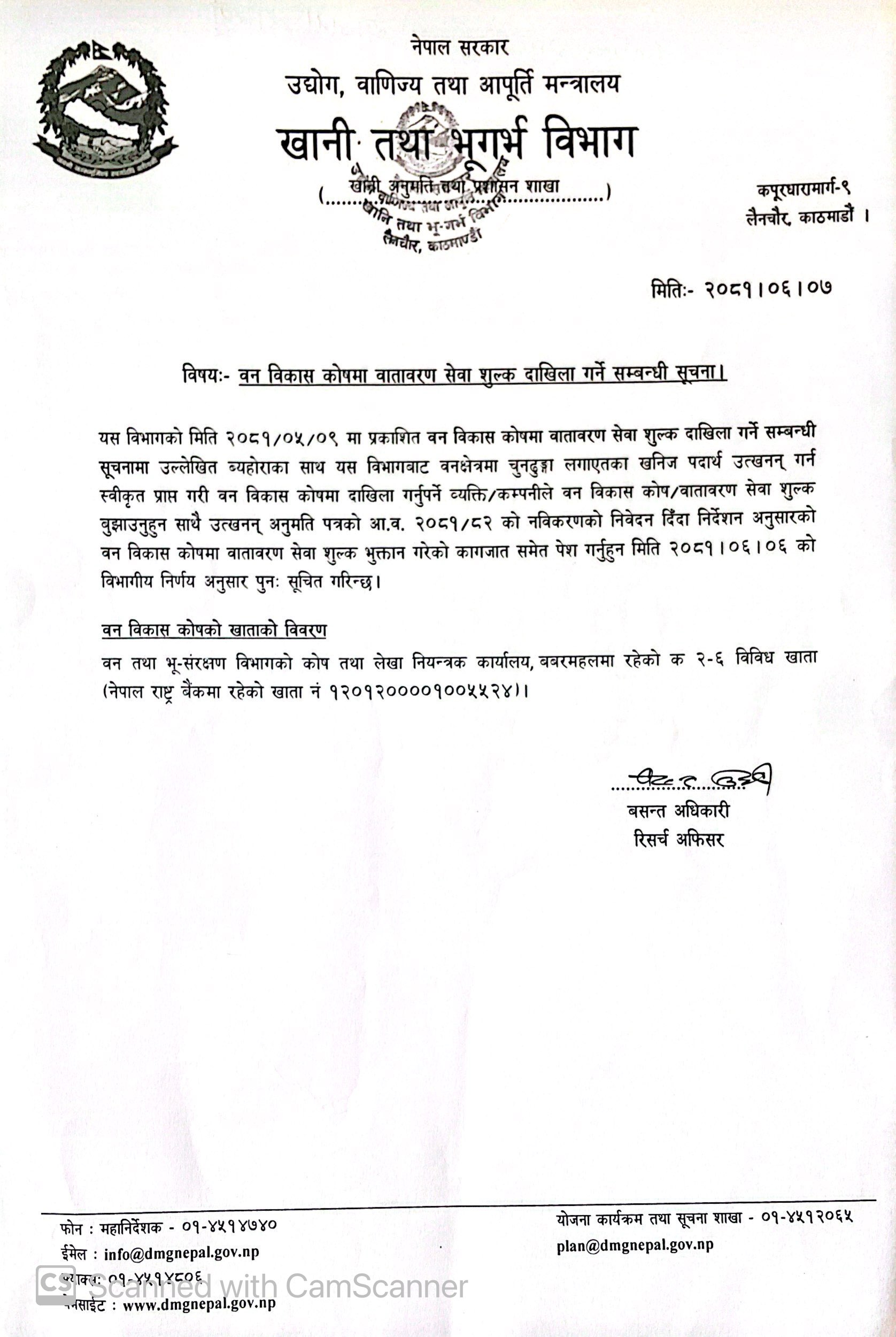 Notice regarding the filing of environmental service charges in the Forest Development Fund