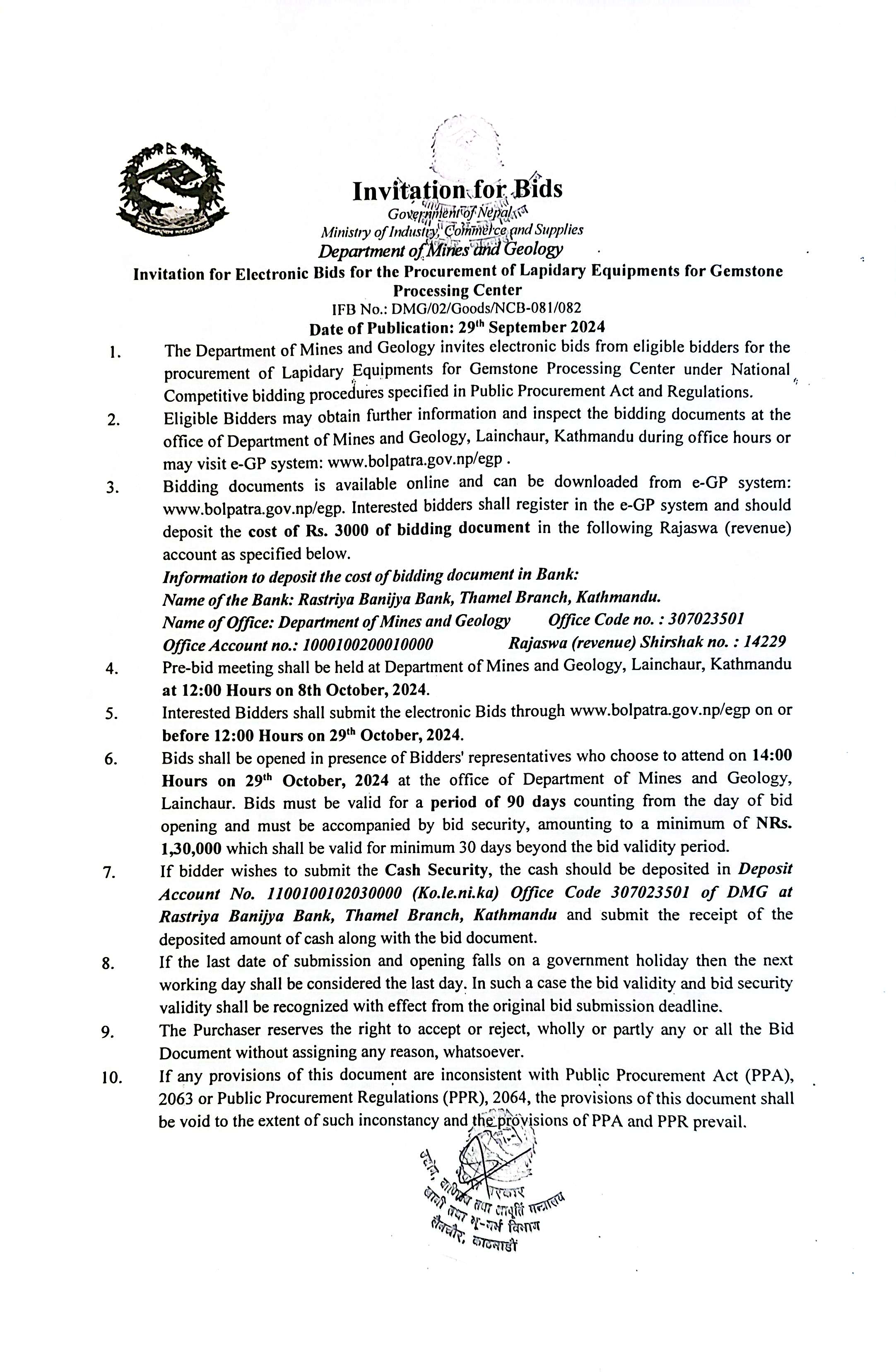 Notice regarding Initiation for electronic bids - Lapidary equipment for gemstone processing center