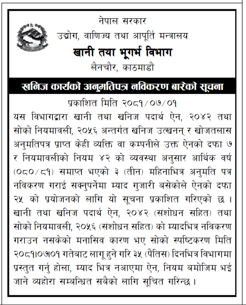 Notice: Regarding Renewal of License in Extended Time for FY 2081.82