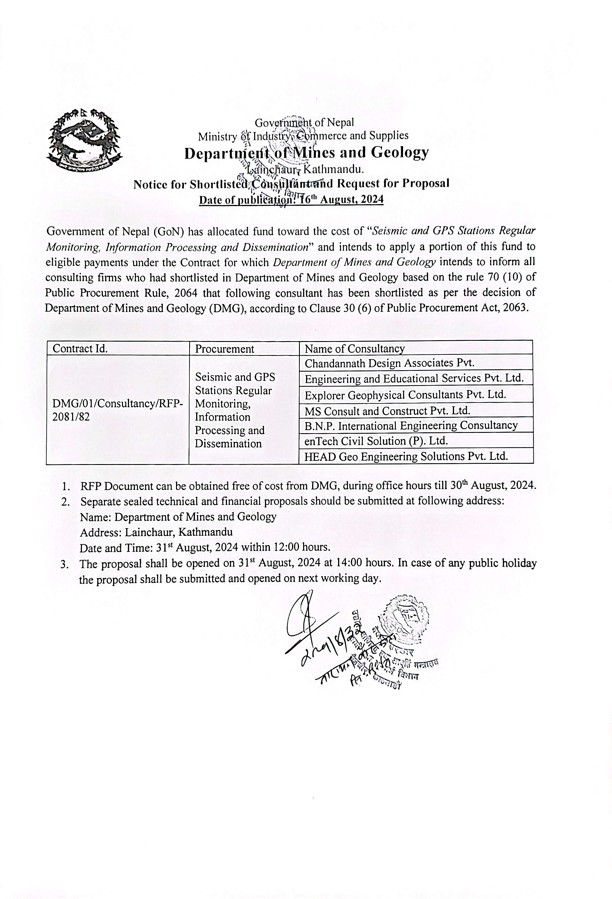 Notice for Shortlisted Consultant and Request for Proposal