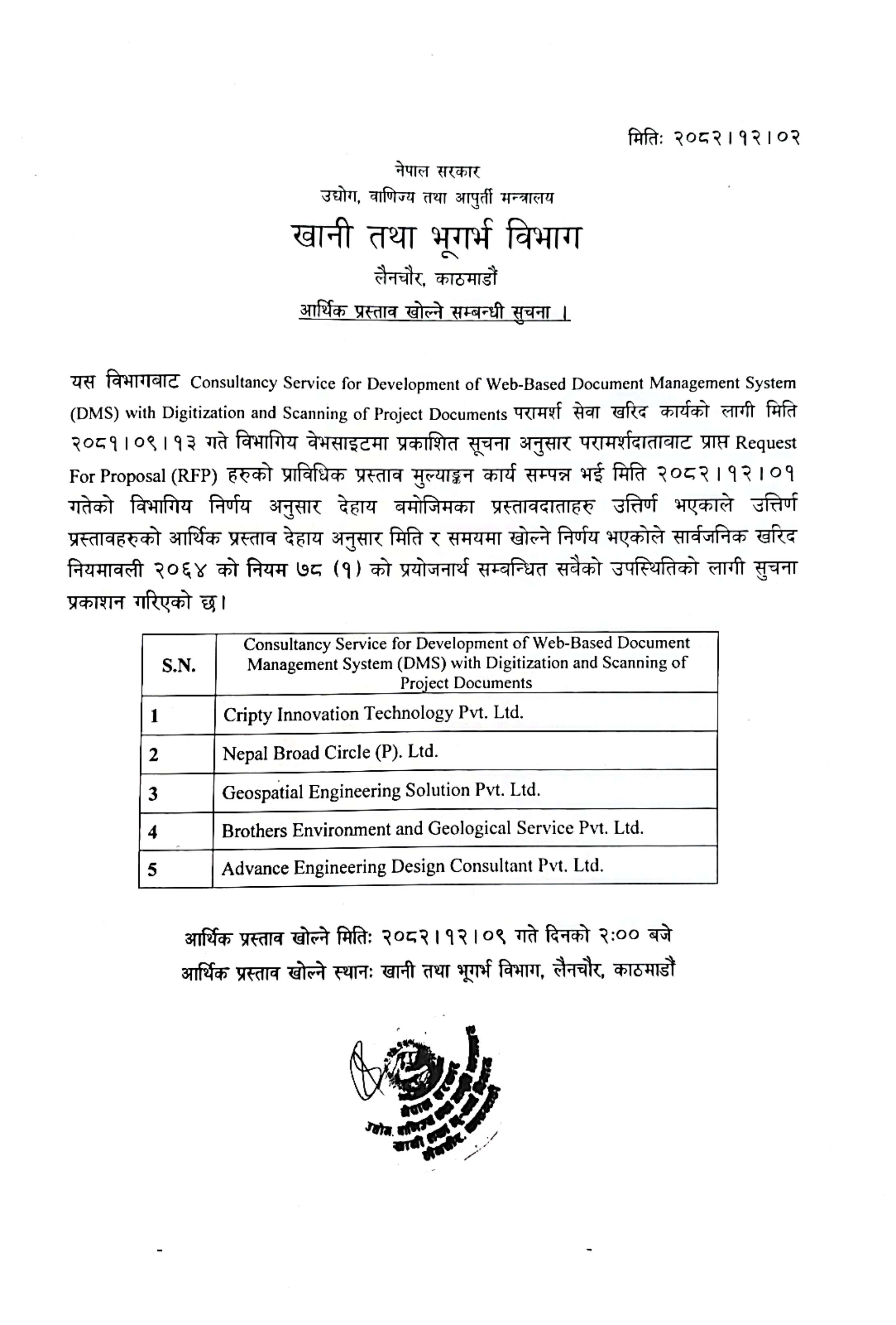 आर्थिक प्रस्ताव खोल्ने सम्बन्धी सूचना